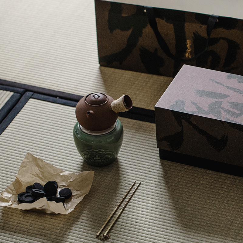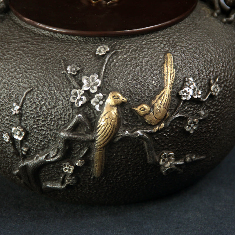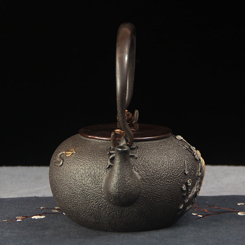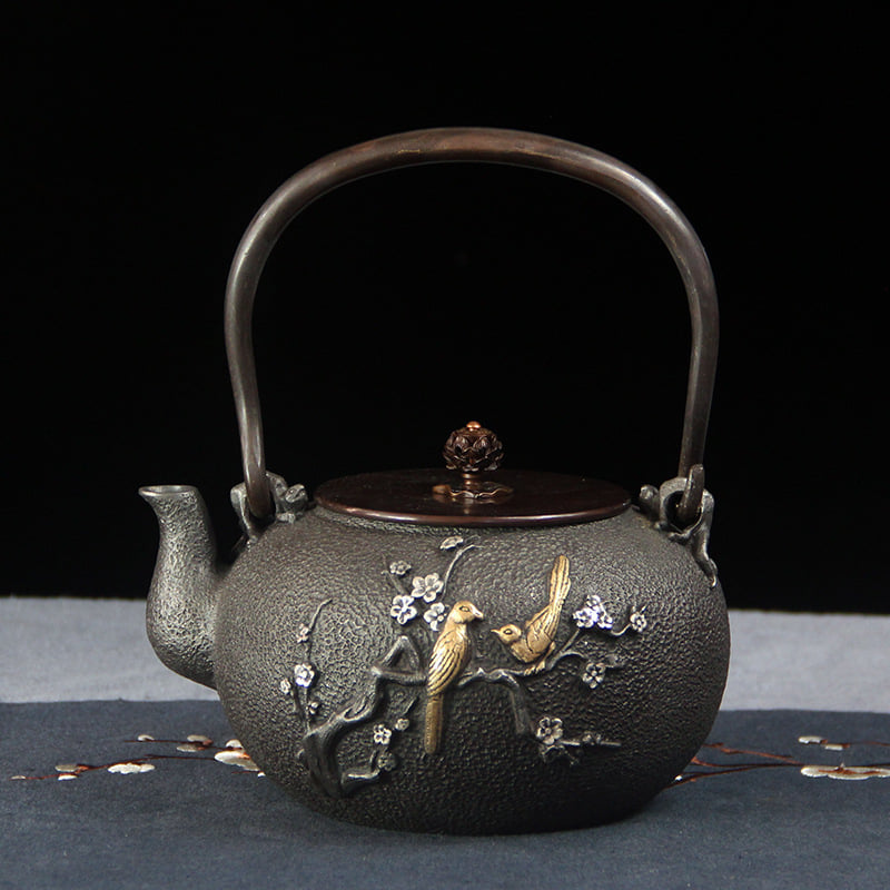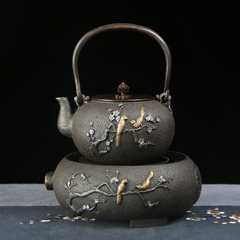 Xét về mặt phong thủy, hỷ tước chính là loài chim báo hiệu niềm vui, sự may mắn giúp gia chủ gặp được nhiều điềm lành, như ý cát tường. Hình ảnh “Hỷ tước đăng mai” (chú chim hỷ tước đậu trên cành mai) lại mang ý nghĩa “Hoa mai khoa nhị đón điềm tốt, chim khách trên cây báo điềm lành”. Ngoài ra hình ảnh đôi chim hỷ tước chính là biểu tượng của “song hỷ”. Họa tiết đồng bộ trên cả ấm và bếp, thân bếp khắc thêm họa tiết chữ Hỷ vừa để trang trí vừa để tản nhiệt nhanh khi tắt bếp. Quai ấm bằng đồng, móc quai mô phỏng con thạch sùng oằn lưng bám lên thân ấm.