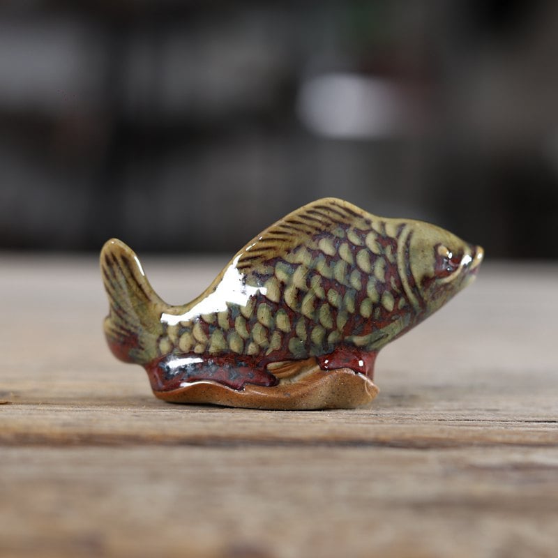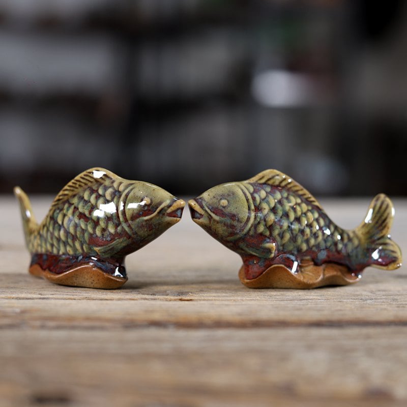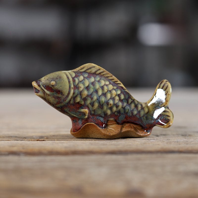 Cá chép được làm từ gốm tráng men có màu xanh cổ kính. Quý khách có thể bày bàn trà làm đồ chơi, trang trí