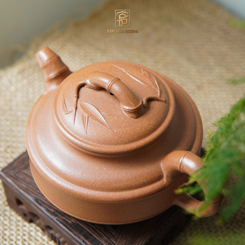 Ấm lấy cây trúc là chủ đề chính ngụ ý "trúc báo bình an" tượng trưng cho sự trường thọ,may mắn và bình an. Thân ấm có dáng đứng hơi tròn, trên thân có hoạ tiết lá trúc thể hiện kết cấu mỏng như cánh ve...