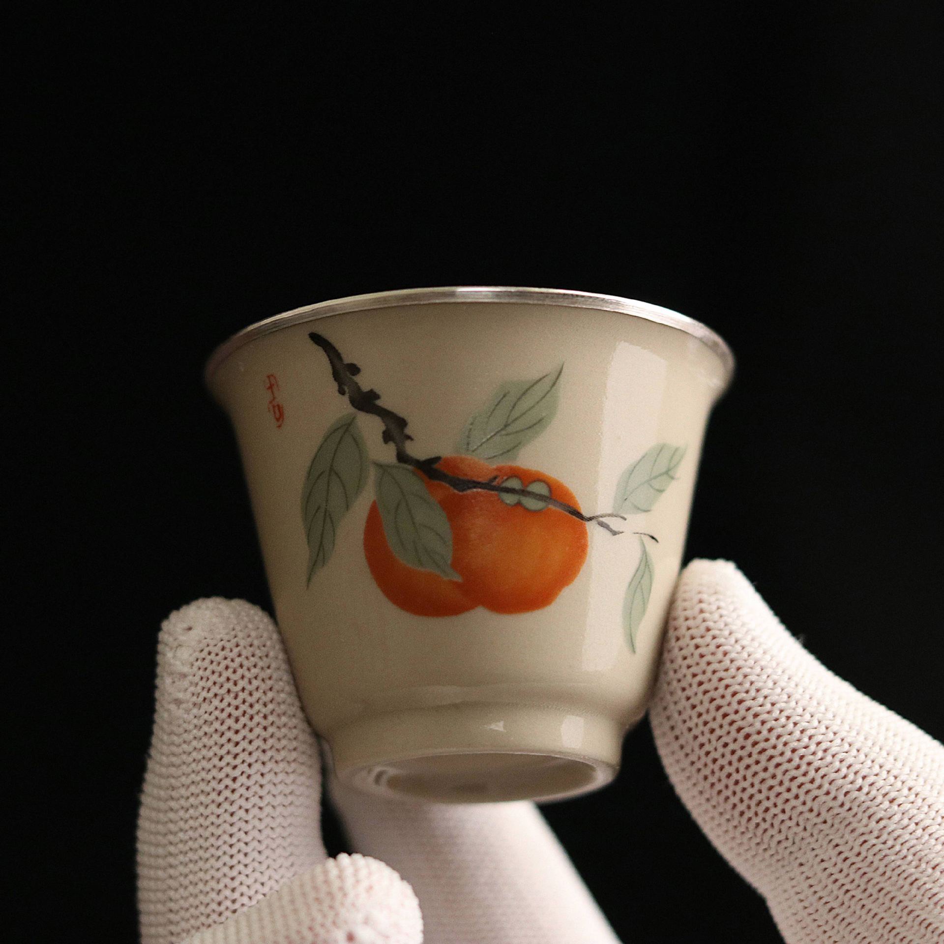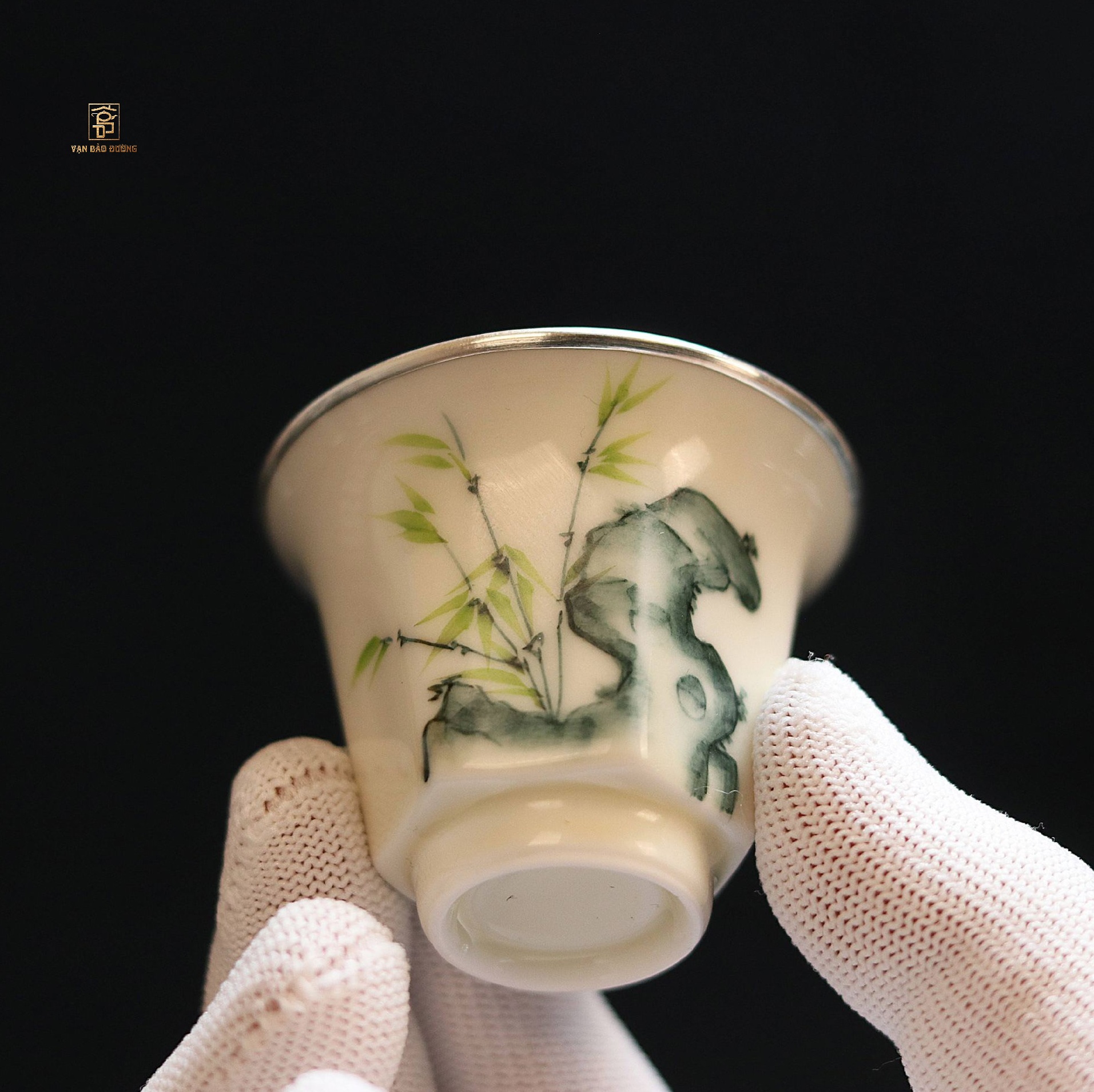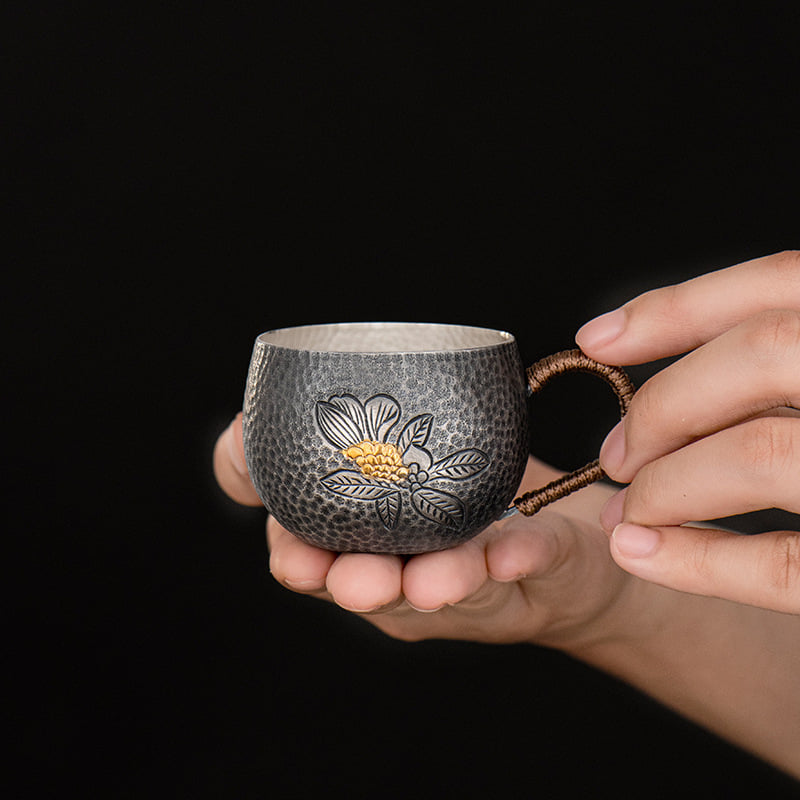 Chén trà bạc nguyên chất hoa Mộc Lan khảm vàng
