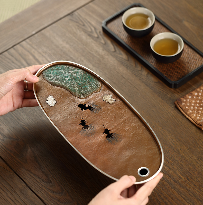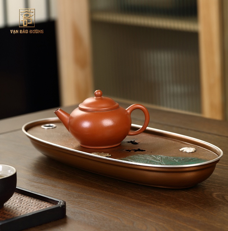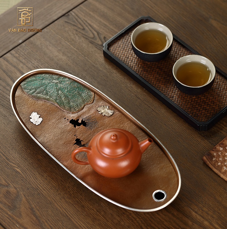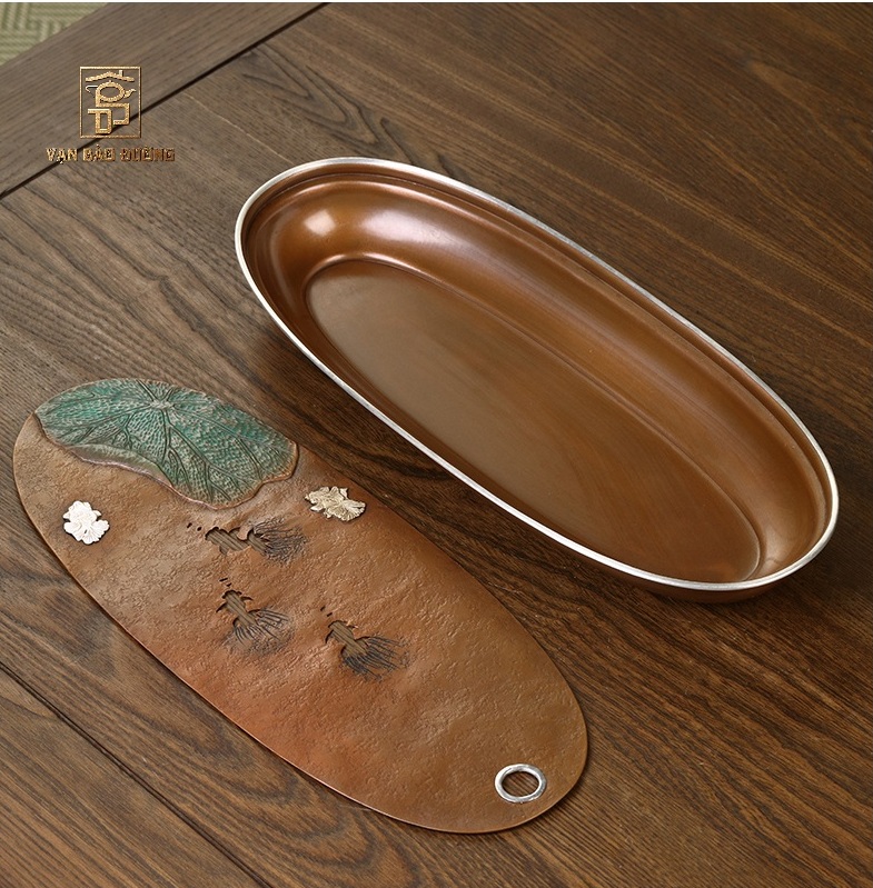 Khay trà đồng Liên Dư tạo hình một hồ sen vào độ cuối thu chỉ còn lá và vài chú cá nhỏ rất sinh động. Sen - cá biểu ý cho sự "dư dả liên tục" nghĩa là không phải lúc dư lúc thiếu. Viền khay bọc bạc nguyên chất tinh tế
